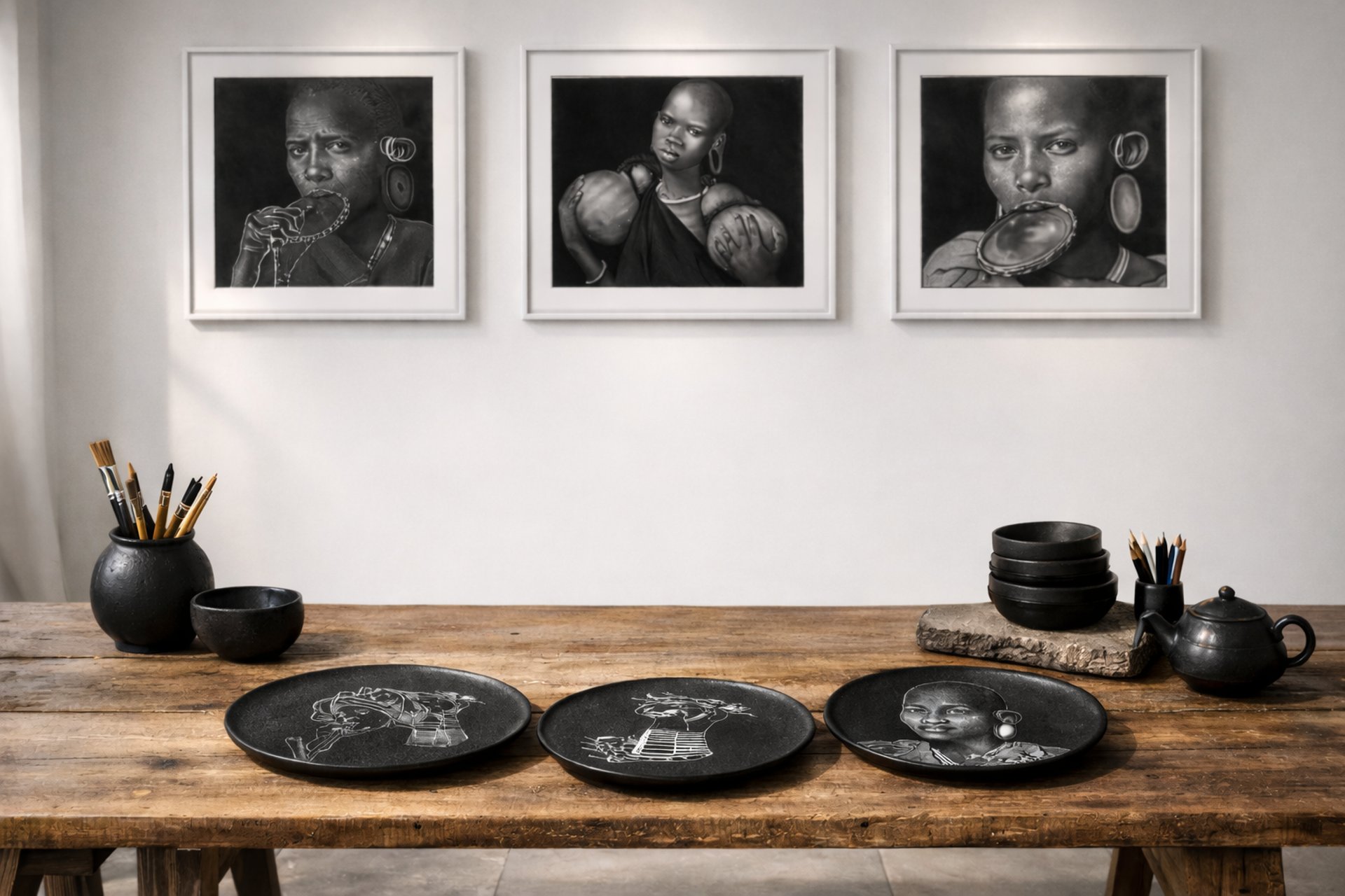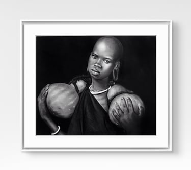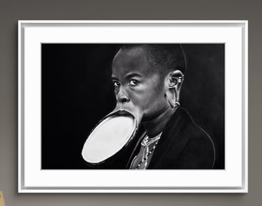 Each artwork is crafted through the slow, intentional layering of graphite and charcoal, drawing inspiration from the strength, feminine authority, and ancestral depth carried by Mursi women. Through the interplay of shade and light, the collection seeks to highlight their quiet yet commanding energy — not as artifacts of culture, but as living embodiments of history, identity, and self-expression.